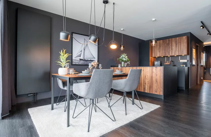 Neubauapartment als Designstatement: Edles Nussbaumholz verleiht einer Privatwohnung in Oberösterreich Stil, während ein offener, reduziert gestalteter Ess- und Wohnbereich für Gemütlichkeit und Übersicht sorgt. Verantwortlich für die maßgefertigte Komposition ist der TEAM 7 Flagshipstore Linz.