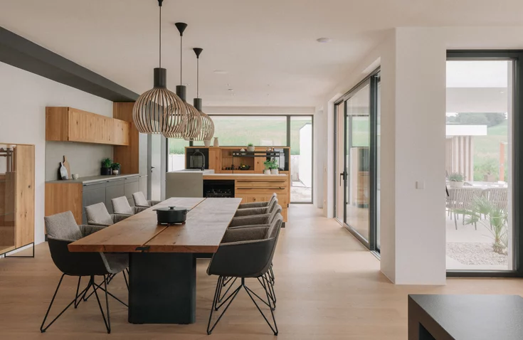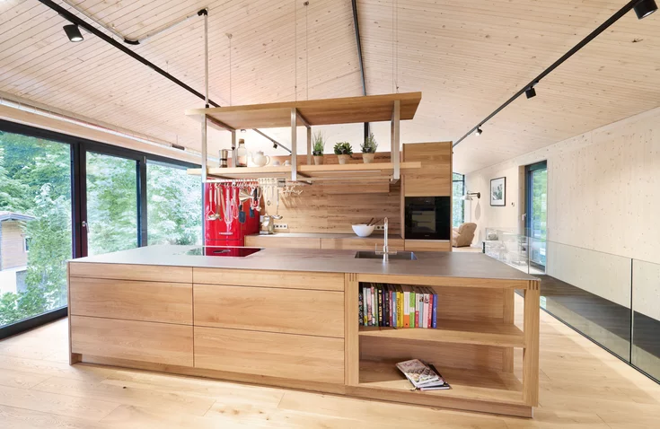 Die Grenzen zwischen Natur und Architektur aufheben: In Baden-Württemberg verschmilzt ein neu gebautes Einfamilienhaus gekonnt mit der grünen Umgebung. Die maßgefertigte Naturholzküche von TEAM 7 fügt sich in Form und Material nahtlos in die offene, organische Gestaltung ein.