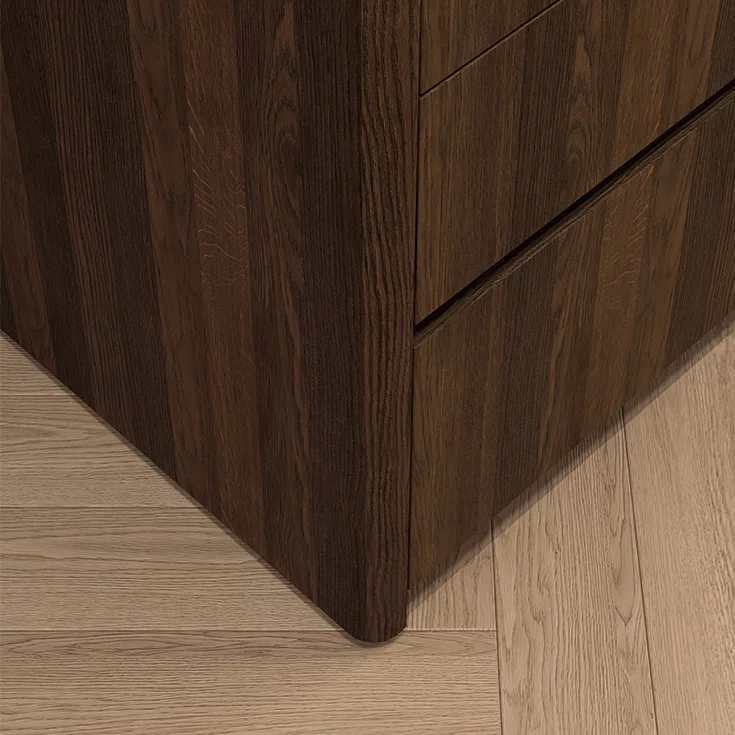 Die senkrechten Fräsungen in den Fronten und Seitenwangen zeugen von präziser Handwerkskunst und heben den Massivholzcharakter hervor. Sie setzen haptische Akzente und erzeugen optische Tiefeneffekte. Variierend in den Abständen verschmelzen sie mit den Frontfugen zu einem harmonischen Ganzen, wodurch die einzelnen Schränke in ihrer Anmutung wie ein einziges Möbel wirken. Durch die Asymmetrie der Rillenstruktur und der stets senkrechten Maserung entsteht eine lebendige Optik über mehrere Fronten hinweg, die auch bei individuellen Breitenkürzungen ihre durchgängige Ästhetik behält.